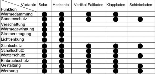An Hand der folgenden Darstellung sollen die verschiedenen Varianten auf Ihre möglichen Funktionen untersucht werden. Neben den energetischen Möglichkeiten bietet die „Plastische Solarfassade“ zahlreiche weitere Anwendungsmöglichkeiten. Um hier einen möglichst umfassenden Überblick zu geben, werden diese ebenfalls aufgeführt. Diese Tabelle (Abb. 3) beinhaltet auch den Klapp- (Dreh-) und Schiebeladen. Diese Systeme können eine sinnvolle Ergänzung des Faltladens sein.